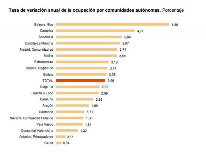 Si se miran los incrementos en porcentaje, se puede vislumbrar la importancia del turismo. Las regiones con los mayores aumentos del empleo respecto al año pasado son Illes Balears (6,86%), Islas Canarias (4,77%) y Andalucía (3,99%).