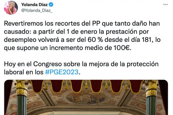 Para rematar ha señalado que es “una extraordinaria noticia” para España. En Twitter ha escrito la ministra: “Revertiremos los recortes del PP que tanto daño han causado: a partir del 1 de enero la prestación por desempleo volverá a ser del 60 % desde el día 181, lo que supone un incremento medio de 100€. Hoy en el Congreso sobre la mejora de la protección laboral en los PGE2023”.