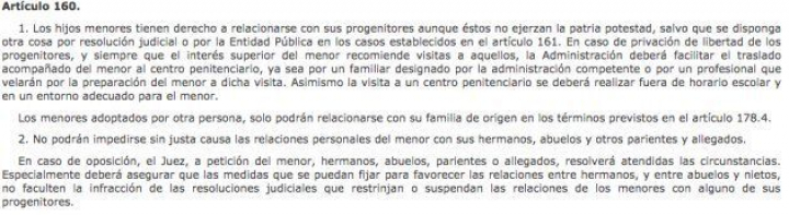 El Código Civil español ya reconoce el derecho de de los abuelos a relacionarse con sus nietos. Se trata del artículo 160.2 del Código: "No podrán impedirse sin justa causa las relaciones personales del hijo con sus abuelos y otros parientes y allegados".