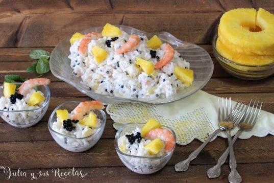 ▶️ Ingredientes: 100 gramos de arroz largo, 100 gramos de gambas o langostinos cocidos, dos o tres rodajas de piña, 1/2 tarrito de falso caviar (huevas de lumpo o similar), salsa rosa (receta, aquí) o mayon...