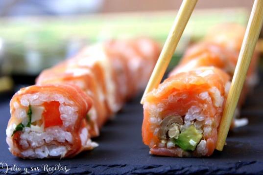 ▶️ Ingredientes. Para el de salmón: cuatro lonchas de salmón ahumado, un aguacate, 100 gramos de atún en aceite, arroz de sushi, salsa de soja para acompañar. Para el de jamón serrano: jamó...