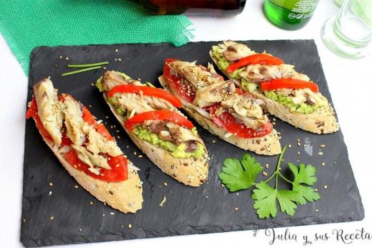 ▶️ Ingredientes: un aguacate maduro, un tomate maduro, dos latas de caballa, cebolleta o cebolla picadita, perejil picado, semillas de sésamo, ocho rebanadas de pan, zumo de limón, pimiento rojo asado e...