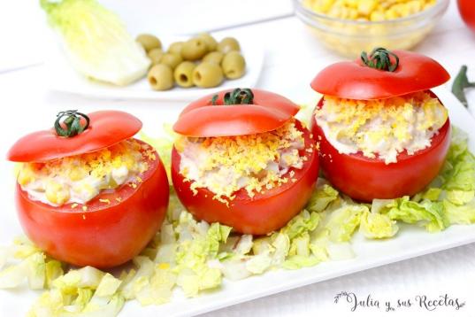 ▶️ Ingredientes: cuatro tomates medianos, una lata de atún, dos huevos cocidos, maíz dulce, aceitunas verdes picadas, mayonesa y lechuga picada.▶️ Encuentra aquí la receta completa.