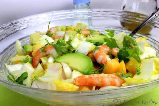 ▶️ Ingredientes: 300 gramos de gambas o langostinos cocidos, un mango o caqui, un aguacate, una cebolla pequeña, una endivia, ralladura de limón, un poco de zumo de limón, aceite de oliva virgen, sal y perejil picad...