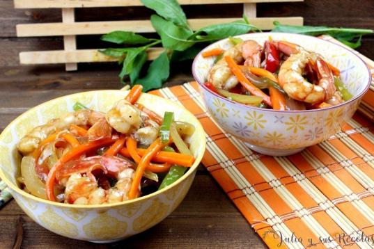 ▶️ Ingredientes: 10 o 12 langostinos o gambones, una cebolla pequeña, un pimiento verde, un pimiento rojo, un pimiento amarillo, una zanahoria, 100 ml de vino blanco, cuatro cucharadas soperas de salsa de soja, 1/2 cucharadi...