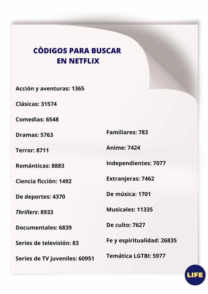 Los códigos salen de esta página, que ha publicado un listado con miles de referencias que permiten a los usuarios acceder a las 18 categorías principales de los contenido de la plataforma, que a su vez se dividen en subcategorías. Si se usan estas claves, el buscador muestra en la pantalla todas las películas románticas, todas las de acción o todos los musicales.