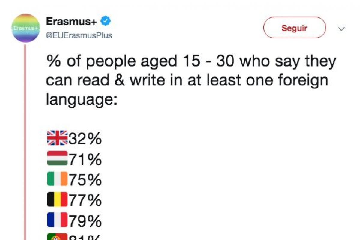 La cuenta oficial en Twitter del programa Erasmus de la Unión Europea ha publicado este fin de semana un gráfico en el que se muestra el porcentaje de jóvenes entre 15 y 30 años que dice que lee y escribe en, al menos, una lengua extranjera.