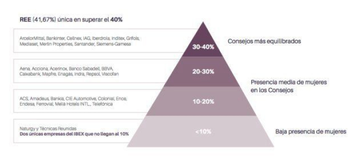 Red Eléctrica es la empresa más paritaria del Ibex 35 al contar con un 41,7% de representación femenina en los consejos de administración. La eléctrica Iberdrola y el banco Santander empatan en segundo lugar, con un 35,7% de mujeres.