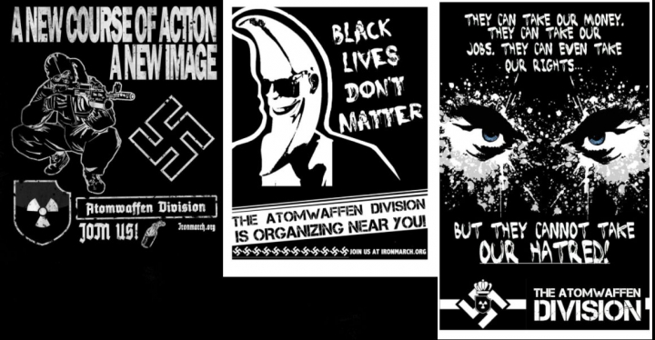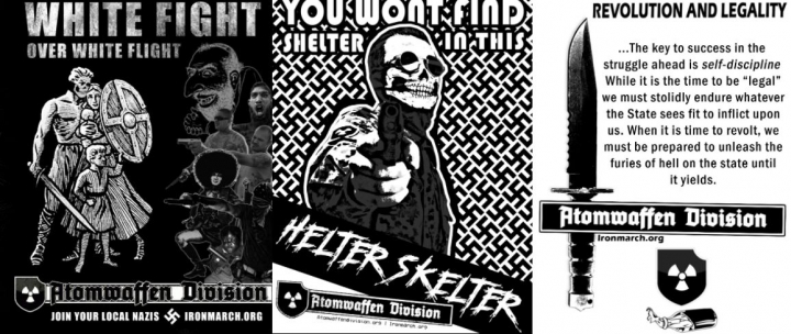 En la práctica, esto significa distribuir folletos de reclutamiento fascista en campus universitarios, colgar carteles con mensajes racistas desde puentes, pintar grafitis y acudir a mítines de los supremacistas blancos para ondear la bandera de la Atomwaffen.