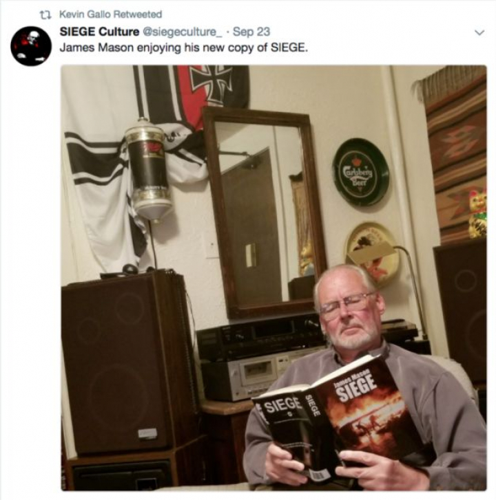 Giampa también elogió un libro de 1992 llamado Siege, una obra racista escrita por el neonazi James Mason, seguidor de Charles Manson. El libro, que defiende una guerra de las razas violenta y condona el asesinato y los ataques terroristas, ha sido sacado de la oscuridad por parte de la Atomwaffen y la web lo volvió a publicar el año pasado.