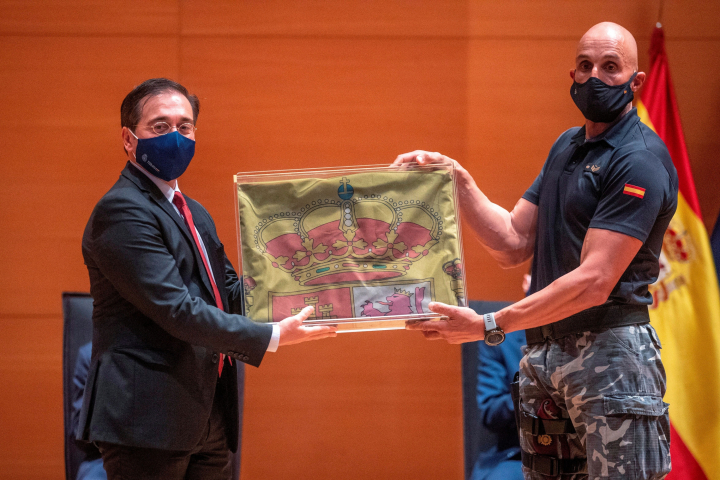 Otro de los momentos destacados de la evacuación fue cuando los policías recuperaron la bandera nacional y la trajeron a España. Durante el acto, uno de los elementos de seguridad le entregó esta insignia al ministro de Exteriores, José Manuel Albares.