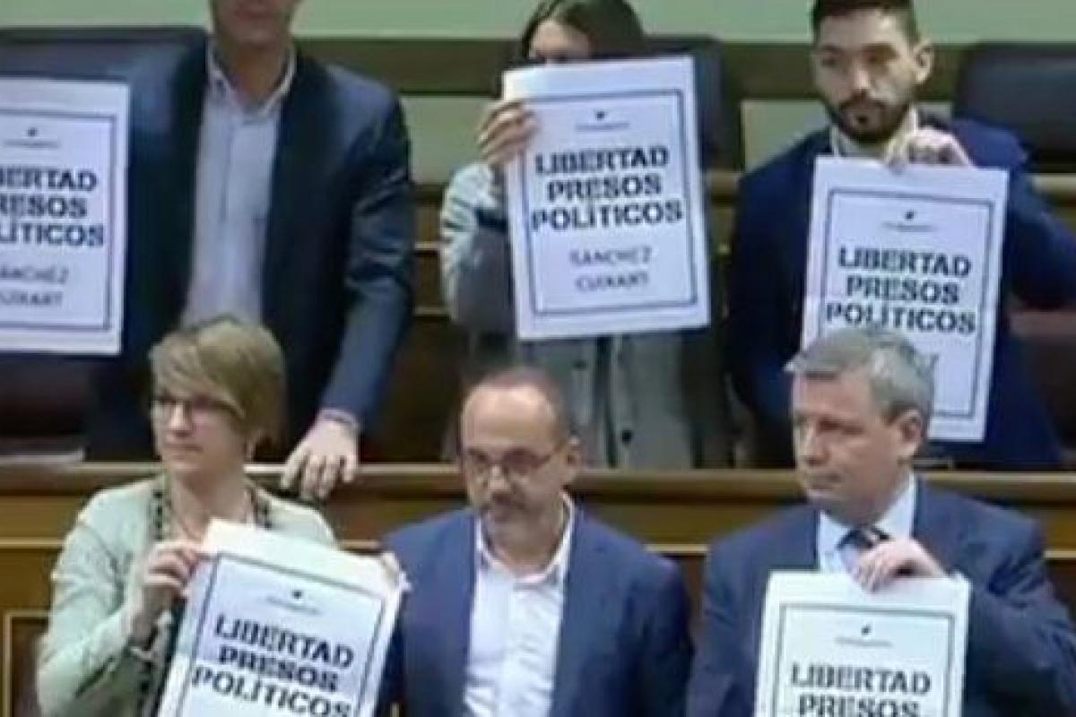 Los diputados de Unidos Podemos se levantan exigiendo la libertad de los Jordis con carteles