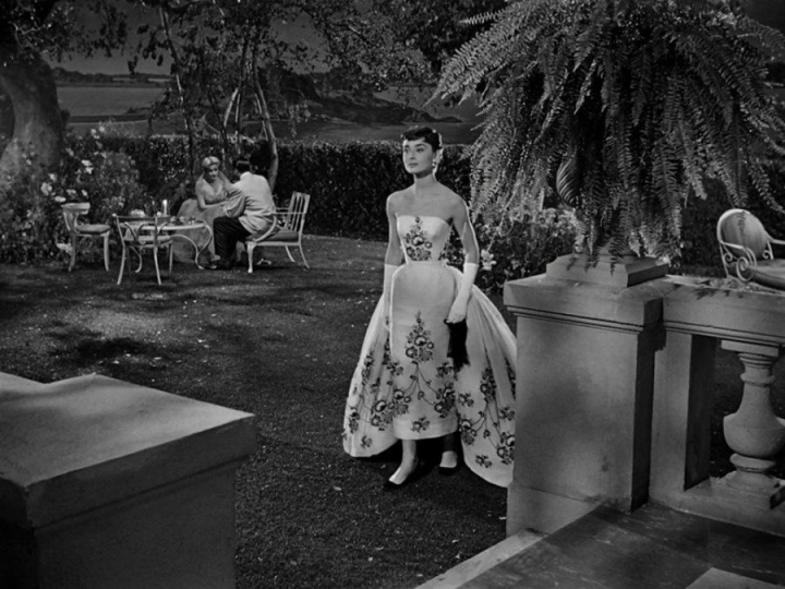 Con su pelo corto, su gorro redondo y sus gafas blancas, el personaje de Hepburn representaba la imagen de la moda de los sesenta. Los abrigos sencillos y empapados de buen gusto que luce durante la película son la combinación perfecta entre el buen hacer de Givenchy y el carisma de la actriz. El vestido negro con transparencias con antifaz a juego es una de esas prendas exquisitas a las que la estrella daba un matiz especial y que es uno de los looks que no pueden faltar en cualquier retrospectiva de Givenchy que se precie.