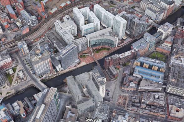 La tuitera Kimberly, buceando por la ciudad de Manchester, se ha dado cuenta de junto al puente de Bridge Street hay un edificio de lo más extraño que no corresponde a la realidad.