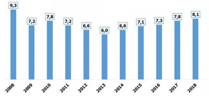 Cada trabajador realizó de media 8,1 horas extraordinarias remuneradas durante el año pasado, lo que implica un 3,8% más que en 2017. Si se mira a la serie histórica, se puede comprobar que el récord de horas extra se alcanzó en 2008, cuando cada ocupado realizó de media 9,3 horas.