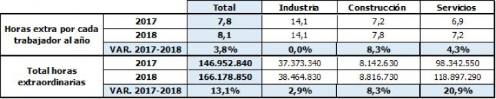A pesar de estas cifras, el sector servicios es el que acumula en total un mayor número de horas extra remuneradas durante 2018, con 119 millones de horas, al contar con más trabajadores que el resto. A continuación se sitúan la industria (38,5 millones de horas) y construcción (8,8 millones de horas).
