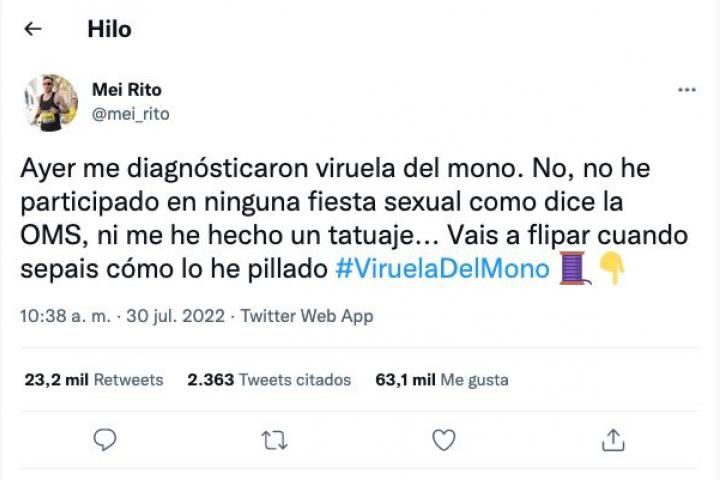 Si eres un usuario más o menos habitual de las redes sociales, es casi seguro que en las últimas horas te has topado con un hilo de Twitter en el que un usuario llamado @mei_rito daba la voz de alarma al afirmar que él se ha contagiado de la viruela del mono al comprar un patinete de segunda mano por Wallapop.