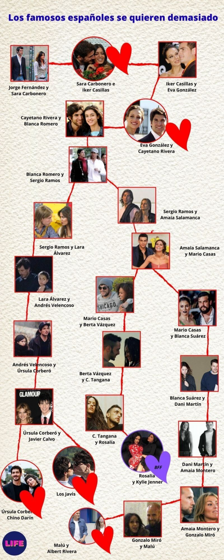¿La principal conclusión? El futbolista Sergio Ramos, ahora felizmente casado con Pilar Rubio; la presentadora Lara Álvarez, el actor Mario Casas y la actriz Blanca Suárez son fundamentales en todo este embrollo... Y eso que no están todos los que son o han sido sus parejas a lo largo de los últimos años.