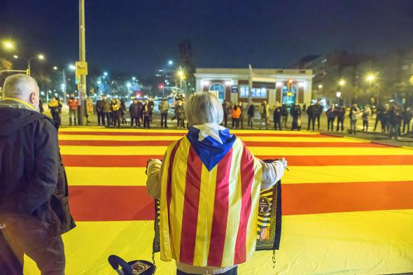 Un grupo de personas ondean banderas de España al paso de la marcha convocada por los CDR que camina desde Casteldefels hacia Barcelona para unirse a las otras cinco "Marchas por la Libertad" que confluyen este viernes en la capital catalana