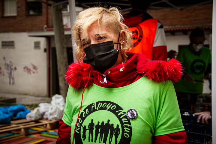 Cada sábado, la sede y los alrededores de la Red de Apoyo Mutuo se convierten en un hervidero de gente y actividad. Allí se dan cita una parte de los 120 voluntarios de la asociación, y unas 350 personas apuntadas para recibir alimentos cada dos semanas. La Red de Apoyo Mutuo nació en abril de 2020 como una necesidad en el barrio de Aluche, uno de los más humildes de Madrid, y como tal se ha mantenido gracias al trabajo de los voluntarios y a las donaciones de personas anónimas, de marcas y de comercios de la zona. Sin ayudas gubernamentales.