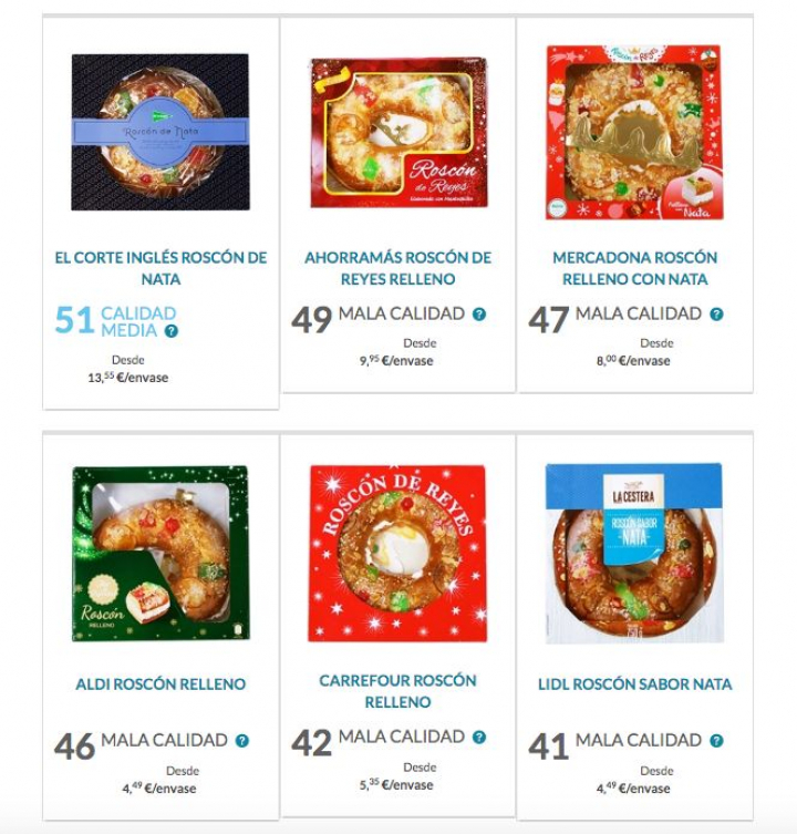 Hay cinco cadenas de supermercados cuyos roscones suspenden este análisis de la OCU: Ahorramás, Mercadona, Aldi, Carrefour y Lidl. Todas ellas han obtenido la calificación de “mala calidad” y no han superado los 50 puntos.