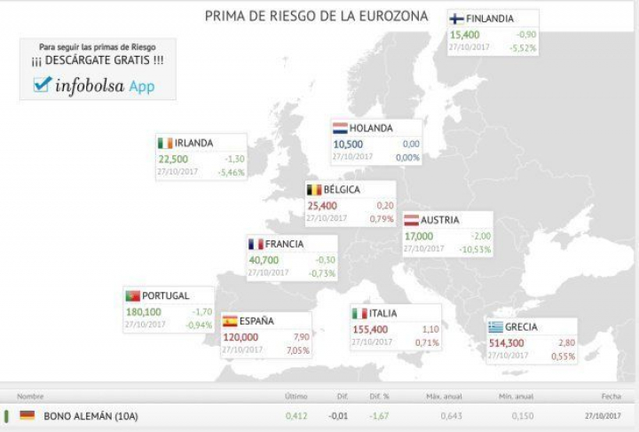 En relación con alguno de los países del entorno, la prima de riesgo de Portugal se sitúa los 180 puntos y la de Italia en los 156 puntos. En el lado, con mucho mejor acceso a los mercados que España se encuentra Francia, con su prima de riesgo en 41 puntos.