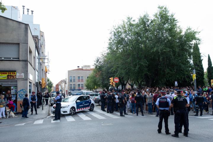 Mossos d'Esquadra controlan a la multitud que se ha congregado ante el domicilio en el que agentes de la Guardia Civil llevan a cabo un registro en Sabadell (Barcelona).EFE