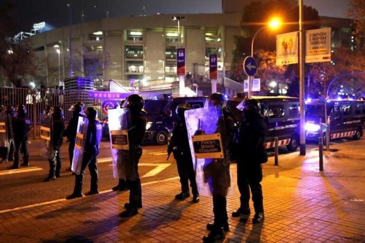 Mossos de Esquadra en los aledaños del Camp Nou durante la celebración del partido aplazado de LaLiga que disputan este miércoles Barcelona y Real Madrid. Agencia EFE