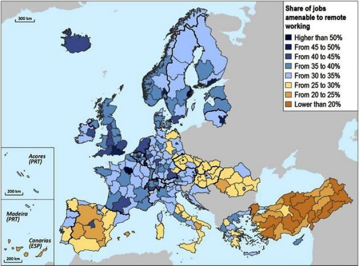 Otro de los factores que ha afectado a la economía española es la baja capacidad para implantar el teletrabajo. El Banco de España estimaba, en un informe reciente, que solo cerca de un tercio de los trabajadores, el 30,1 %, podía trabajar desde casa.