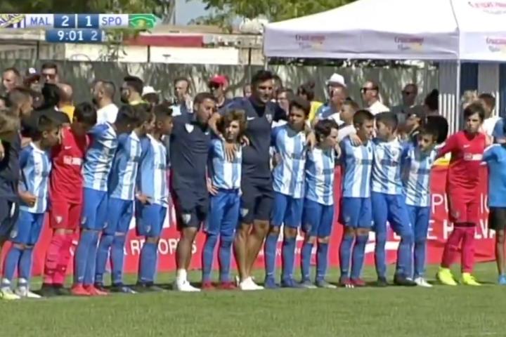 Los componentes del equipo alevín del Málaga club de fútbol reprobaron la actitud de sus familiares en las gradas, durante un partido de un torneo que disputaron en Punta Umbría (Huelva), y les dieron la espalda en señal de rechazo por el altercado que protagonizaron con aficionados del Sporting de Portugal.
