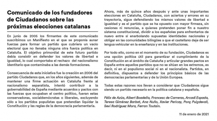 Los fundadores de Ciudadanos han vuelto a tomar la palabra para defender a su “hijo político” en la previa de las elecciones catalanas. En un comunicado que se ha difundido en las redes sociales, diez “padres fundadores” de Cs han señalado que el partido naranja “sigue siendo necesario” como en el momento de su fundación pese a los “errores en su trayectoria”.