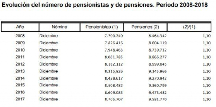 Si se echa la vista atrás, la Seguridad Social ha pasado de tener 8,4 millones de pensiones en 2008 a superar los 9,5 millones en 2017. Es decir, el número de pensiones y de pensionistas se ha incrementado en un millón en una década, tal y como se puede ver en el siguiente cuadro.