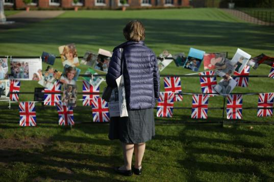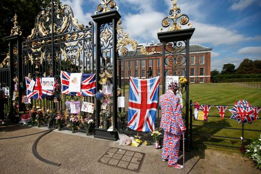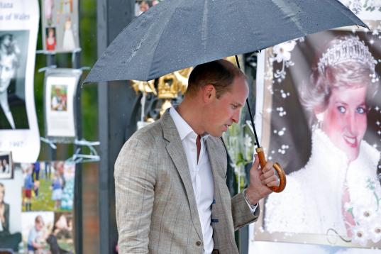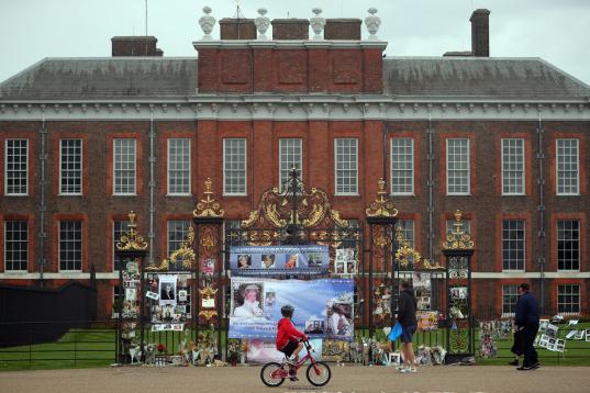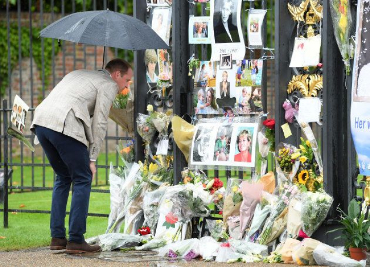 El príncipe Guillermo observa el homenaje a Diana en las vallas del palacio de Kensington, en Londres.Karwai Tang via Getty Images