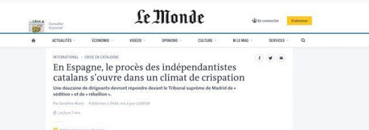 El diario francés también se hace eco de la noticia del día en España: "El juicio de los separatistas catalanes empieza en un clima de tensión'.