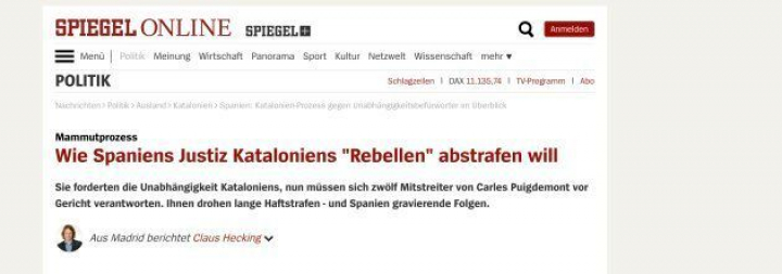 El diario alemán titula: "Cómo el poder judicial español planea castigar a los "rebeldes" de Cataluña' y hace referencia a los "12 compañeros de Carles Puigdemont" que se enfrentan "a largas penas de prisión".
