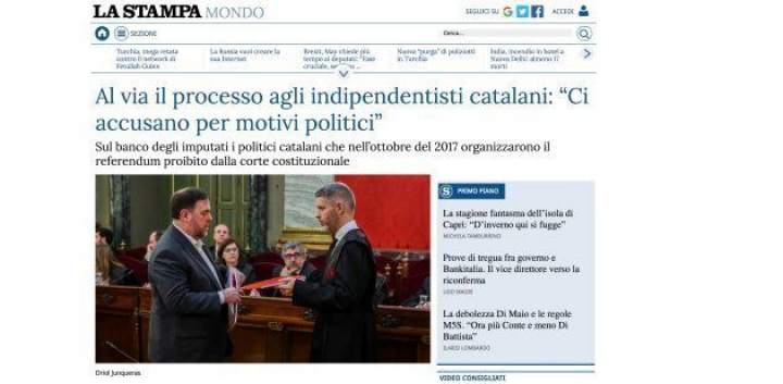 El diario italiano se ha hace eco de las palabras de los separatistas catalanes: "Nos acusan por motivos políticos". En el subtítulo explican que se sientan en el banquillo los que "organizaron el referéndum prohibido por el Tribunal Constitucional en octubre del 2017".
