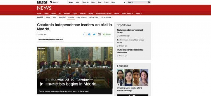 La cadena pública británica también le dedica un espacio destacado a la noticia del juicio. "Líderes de la independencia catalana, a juicio en Madrid", reza el titular de la información.