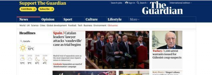 El diario británico, adicto a los minutos a minutos, abre su página de Internacional con un directo sobre el juicio, acompañado por las palabras del abogado de Oriol Junqueras y Raül Romeva, Andreu Van den Eynde, que ha afirmado que esta causa es un "vodevil procesal" que "atenta contra la disidencia política". Ya en el interior este medio califica el juicio como "el más importante desde el regreso de España a la democracia".