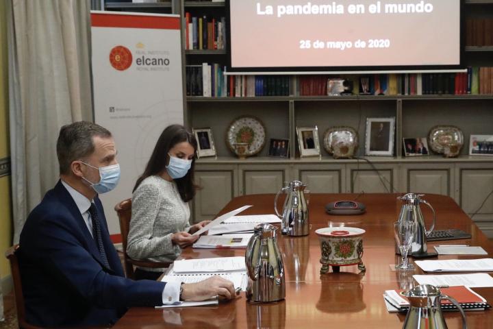 Acompañados por el ministro de Ciencia y Tecnología Pedro Duque, Felipe y Letizia han presidido la reunión especial del Consejo Científico el Real Instituto El Cano, en la que se ha explicado y contextualizado el impacto mundial de la pandemia.