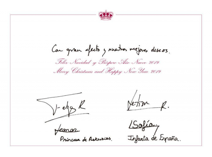 A la foto de la familia, que en 2017 felicitaron la Navidad con una imagen ante el Palacio Real, le acompaña un mensaje de buenos deseos. "Con gran afecto y nuestros mejores deseos", dice el texto escrito (a juzgar por la letra) por el monarca y al que siguen las firmas de Felipe, Letizia, Leonor y Sofía. Ninguno ha cambiado su rúbrica desde el año pasado, cuando el christmas fue mucho más sobrio (sin ningún texto de felicitación) y cuando se supo que Leonor había heredado la "L" de Letizia.