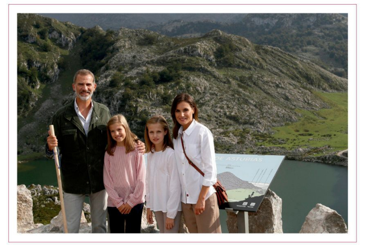 En la imagen, los monarcas posan con sus hijas, la princesa Leonor y la infanta Sofía, junto a los lagos de Covadonga, en Asturias. Es un recuerdo del histórico viaje que realizaron a principios de septiembre (todavía era verano) con motivo de los actor del Centenario de Covadonga 2018 y en el que tuvo lugar el primer acto oficial de la princesa.
