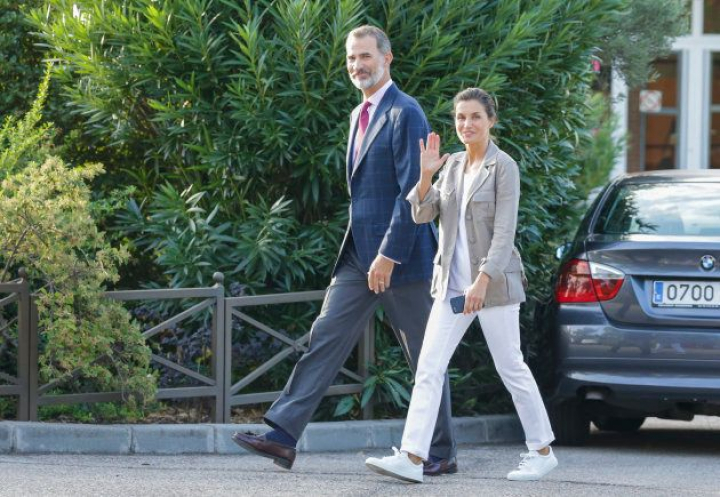 Don Felipe y doña Letizia han saludado desde el vehículo con las ventanillas delanteras bajadas —y también sus hijas, a través de los cristales— a los reporteros gráficos que les aguardaban tanto a la llegada como a la salida del centro, donde los reyes han permanecido una media hora.