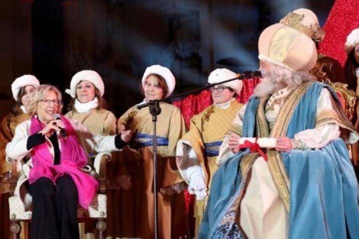 La alcaldesa de Madrid recibe a Melchor, Gaspar y Baltasar en el Ayuntamiento de la capital.