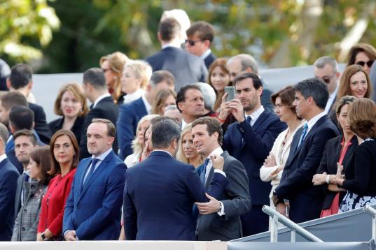 Los partidos políticos también han estado representados en el desfile. En el caso del PP, Pablo Casado se ha estrenado en este 12 de octubre como líder de los 'populares'. Albert Rivera ha representado a Ciudadanos mientras que el líder de Podemos, Pablo Iglesias, ha decidido no acudir igual que haya hecho ya en anteriores ocasiones. La representación del partido morado ha corrido a cargo de Gloria Elizo y José Antonio Delgado, quienes sin embargo no asistirán a la recepción posterior en el Palacio Real.