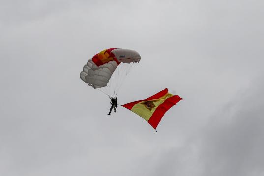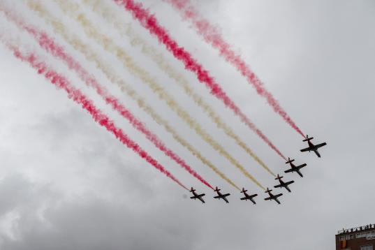 Finalmente, la lluvia ha hecho acto de presencia al comienzo y al final de la parada militar, provocando la suspensión del desfile aéreo. Estaba prevista la participación de 88 aeronaves entre cazas, aviones de transporte y helicópteros. Sin embargo, finalmente sólo han podido volar los siete aviones de la Patrulla Águila que han pintado la bandera de España en el cielo de Madrid tras el homenaje rendido a los caídos.