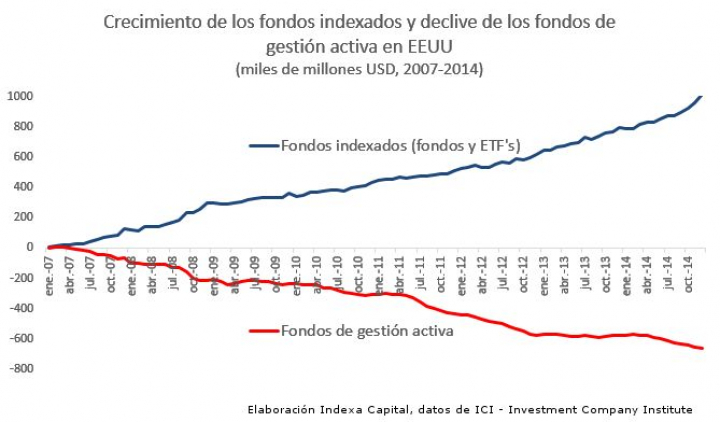 A día de hoy las estadísticas dicen que la mayoría de fondos gestionados son incapaces de superar al propio indice sobre el que están invirtiendo. Así pues, parece absurdo pagar una comisión de hasta un 3% a un gestor que tiene un porcentaje muy alto de posibilidades de no superar ni tan siquiera al propio índice. Para eso puede resultar más interesante invertir en el propio índice y pagar mucha menos comisión para ver aumentada tu rentabilidad, ¿no?