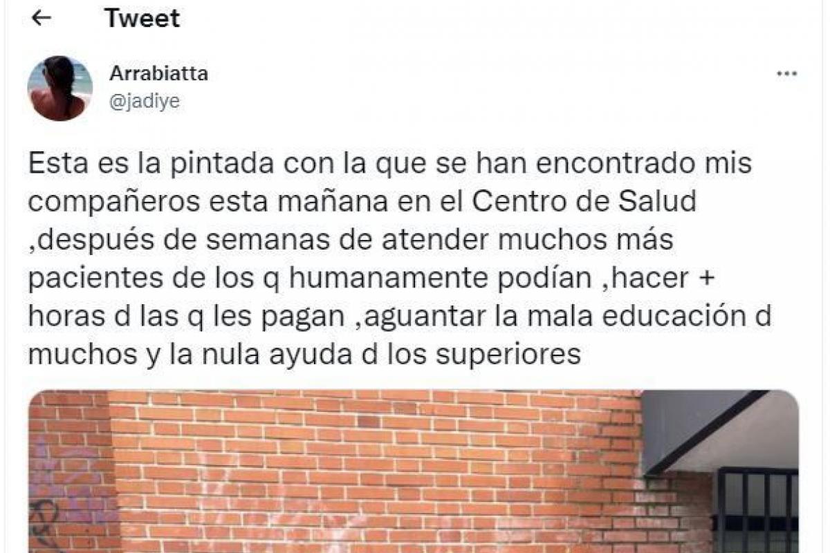 “Esta es la pintada con la que se han encontrado mis compañeros esta mañana en el Centro de Salud, después de semanas de atender muchos más pacientes de los que humanamente podían, hacer más horas de las que les pagan, aguantar la mala educación de muchos y la nula ayuda de los superiores”, se lamenta la usuaria.