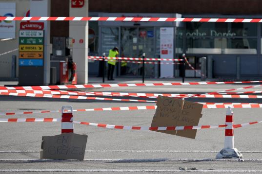 A placard reading "We want to live from our wages" is seen at a closed TotalEnergies oil station in Le Rove near Marseille, southern France, on October 11, 2022. - Around a third of France's service stations were still low on, or out of, petrol ...