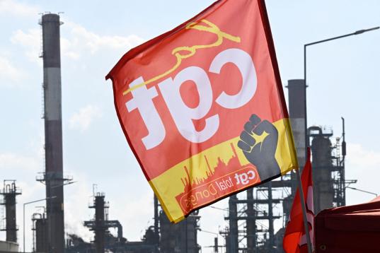 A CGT Union flag is seen as trade unionists and striking employees gather outside the TotalEnergiesrefinery site, in Donges, western France, on October 12, 2022. - France's Prime Minister announced on October 11, 2022 the requisition of staff to...