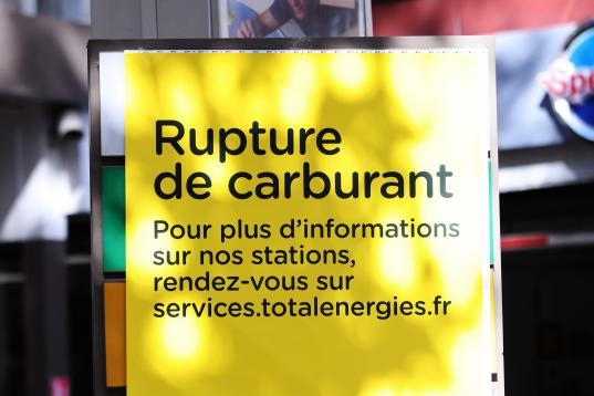 A poster reads stock-out is seen in front of a Total Energies gas station in Paris, France, Oct. 6, 2022. (Photo by Gao Jing/Xinhua via Getty Images)